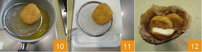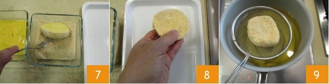Enfin, passez-le dans la chapelure 7 en veillant à ce qu'il soit bien recouvert de tous les côtés. À ce stade, transférez-le sur un plateau 8 et continuez avec les autres tranches. Dès que l'huile est à température, plongez quelques morceaux à la fois 9, afin de ne pas trop baisser la température.