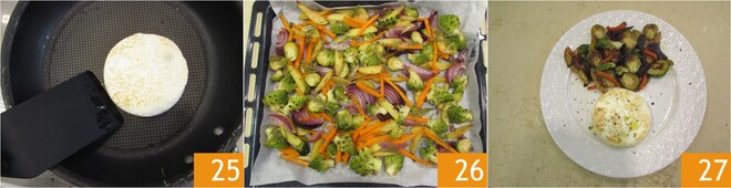 Quand il sera légèrement doré, retournez-le 25 et faites-le cuire pendant encore 2-3 minutes. Sortez également les légumes du four 26. Accompagnez le primosale avec les légumes de saison, en ajoutant une pincée de poivre noir et un filet d'huile 27.