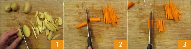 Pour préparer le primosale à la poêle avec des légumes, commencez par bien laver tous les légumes. Prenez les pommes de terre et sans les éplucher, coupez-les en quartiers 1. Passez aux carottes: épluchez-les et coupez-les en deux 1. Découpez ensuite en tranches et enfin en bâtonnets 3
