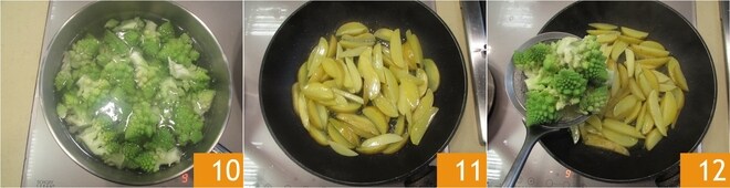 Faites-les blanchir pendant 3-4 minutes 10. Vérifiez en attendant les pommes de terre pour ne pas les brûler 11. Utilisez une écumoire pour retirer le chou romanesco et transférez-le dans la poêle avec les pommes de terre 12