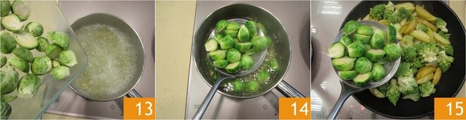 Dans la même eau de cuisson, versez les choux de Bruxelles 13, faites-les cuire pendant 2-3 minutes et comme avant, égouttez-les avec l'écumoire 14. Transférez-les dans la poêle avec les pommes de terre 15