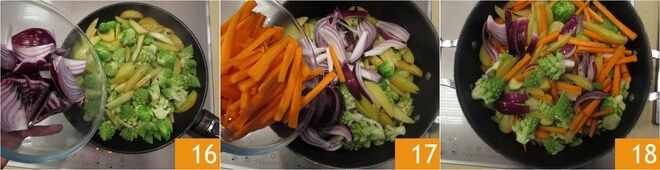 Ajoutez également les oignons 16, les carottes 17 et faites sauter le tout 18