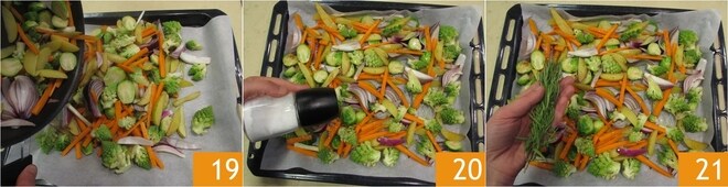 Transférez dans un plat recouvert de papier sulfurisé 19. Assaisonnez avec du sel 20, du poivre, de l'huile et ajoutez le romarin 21. Faites cuire dans un four statique préchauffé à 200° pendant environ 25-30 minutes.
