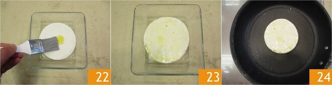 Quand il ne manquera que quelques minutes, commencez à préparer le primosale. Placez une poêle sur le feu et laissez-la chauffer. Huilez avec un pinceau le primosale 22, des deux côtés 23. Placez le fromage dans la poêle chaude et faites-le cuire pendant 2-3 minutes à feu moyen 24