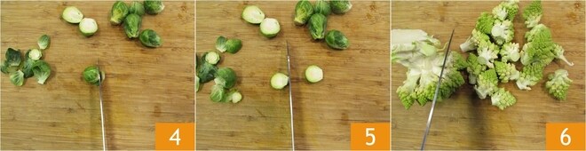 Occupez-vous maintenant des choux de Bruxelles, éliminez les feuilles extérieures et la partie inférieure 4, coupez-les en deux 5 et réservez-les. Prenez le chou romanesco et séparez les fleurettes 6, si elles sont très grosses, coupez-les en deux 6.