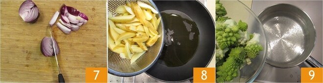 Maintenant, coupez également les oignons en quartiers 7. Mettez sur le feu une casserole remplie d'eau qui servira à cuire les légumes à l'eau. Quand elle sera chaude, versez dans une autre poêle un généreux filet d'huile et ajoutez les pommes de terre 8. Faites-les sauter pendant environ 5 minutes. Entre-temps, plongez le chou romanesco dans l'eau qui aura atteint l'ébullition.