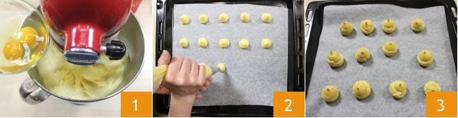 Pour préparer les profiteroles salés, commencez par réaliser la pâte à choux : mettez une casserole sur le feu, ajoutez le beurre, l'eau, le sucre et une pincée de sel, mélangez le tout avec un fouet. Une fois à ébullition, retirez la casserole du feu et ajoutez la farine tamisée. Continuez la cuisson, en remuant le mélange avec une cuillère en bois et lorsque le mélange se détachera complètement de la casserole, retirez du feu et laissez-le refroidir dans une assiette. Une fois refroidi, mettez le mélange dans un robot pâtissier muni d'un crochet feuille (vous pouvez également effectuer cette opération avec une cuillère en bois dans un bol, en mélangeant vigoureusement), et ajoutez les œufs un à un, en veillant à ajouter le suivant seulement lorsque le précédent aura été complètement absorbé par la pâte 1. À la fin vous devez obtenir un mélange lisse et homogène, transférez-le dans une poche à douille munie d'une douille lisse et formez des petits tas de pâte espacés les uns des autres, sur une plaque recouverte de papier sulfurisé 2. Enfournez dans un four statique préchauffé à 170°-175° pendant 30-35 minutes (dans un four ventilé à 150°-155° pendant 25-30 minutes). Une fois le temps de cuisson écoulé, laissez les choux dans le four ouvert pour qu'ils sèchent : ils doivent être légers et croustillants 3. Pour découvrir comment préparer et conserver au mieux les choux, consultez la recette : Pâte à choux (choux).
