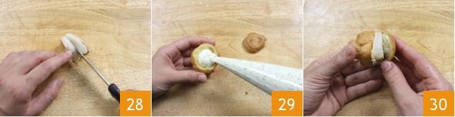 Continuez avec la garniture des choux avec les crevettes : une fois refroidies, divisez les crevettes en deux 28, puis garnissez les choux avec la crème au chèvre 29 et avec une demi-crevette 30, étalez un peu de crème sur le chapeau et scellez le chou.