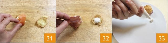 Poursuivez en garnissant les choux restants avec la crème au chèvre et une tranche de saumon 31 et avec la crème au jambon cuit et une tranche de bresaola 32. N'oubliez pas de conserver une ou deux tranches de saumon et de bresaola, qui vous serviront à réaliser la décoration du plat. Pour présenter ce plat de manière sympathique et efficace, vous pouvez disposer les choux garnis en pyramide. Pour commencer, pressez une goutte de crème au choix sur un plat de service assez large 33.