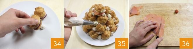 Puis placez le chou garni au-dessus de la goutte de crème 34, de manière à ce qu'il reste bien stable et continuez ainsi avec les autres choux qui formeront la base. Par exemple, vous pouvez former la première couche de la pyramide avec les choux au salami et ensuite continuer avec ceux aux autres saveurs. Une fois la pyramide terminée, décorez les espaces entre les choux avec des petits tas de crème, en alternant éventuellement celle au jambon cuit et celle au fromage de chèvre 35, puis prenez les tranches de saumon que vous avez mises de côté et coupez-les en lanières 36.