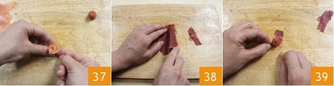 Enroulez les lanières, formant de petites roses et mettez de côté 37. Effectuez la même opération avec les tranches de bresaola : coupez-les en lanières 38 et enroulez-les, créant de petites roses 39.
