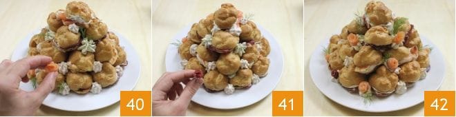 Disposez à volonté les petites roses de saumon et de bresaola dans la pyramide (40-41) et si vous le souhaitez, garnissez également avec quelques touches d'aneth frais 42. Il ne vous reste plus qu'à servir vos profiteroles salés et à les déguster tous !