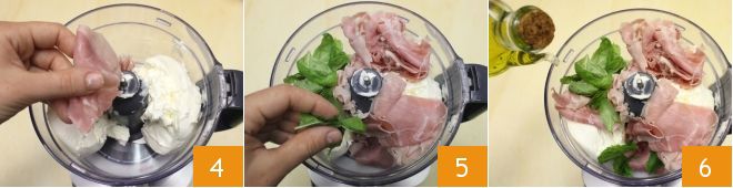 En attendant, préparez les crèmes avec lesquelles vous garnirez les choux, commencez avec celle au jambon : placez le fromage frais à tartiner et les tranches de jambon cuit dans un mixeur 4, ajoutez également les feuilles de basilic et de menthe 5 et assaisonnez d'un filet d'huile 6.