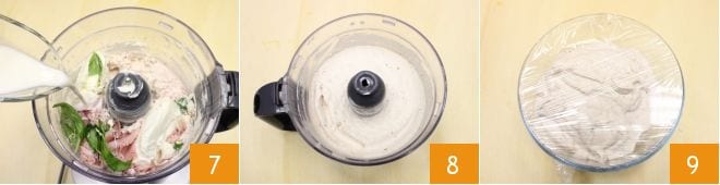 Ajoutez le lait en filet 7, salez et poivrez selon votre goût et mixez jusqu'à obtenir une crème dense et homogène 8. Transférez la crème dans un bol, couvrez de film plastique et conservez au réfrigérateur jusqu'au moment de l'utiliser 9.