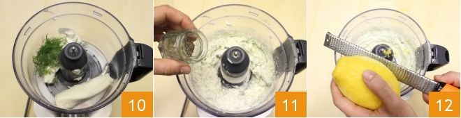 Maintenant, occupez-vous de la crème au fromage de chèvre : versez l'aneth frais et le fromage de chèvre dans le bol d'un mixeur 10 et mixez jusqu'à obtenir une crème dense et homogène. Ensuite, salez et poivrez selon votre goût 11, ajoutez un filet d'huile et râpez ensuite le zeste d'un demi-citron 12.