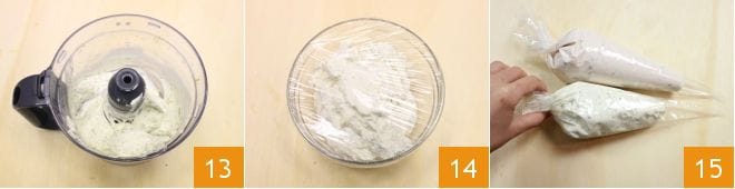 Mixez à nouveau pour bien mélanger le tout 13 et transférez ensuite la crème au fromage de chèvre dans un bol, couvrez-la de film plastique et laissez-la reposer au réfrigérateur jusqu'au moment de l'utiliser 14. Vous pouvez également transférer les deux crèmes directement dans les poches à douille et les laisser refroidir au réfrigérateur 15.