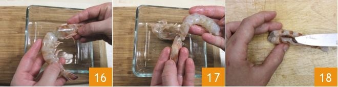 À ce point, poursuivez avec le nettoyage des crevettes, avec lesquelles vous assaisonnerez une partie des choux. Si vous utilisez des crevettes fraîches, rincez-les soigneusement sous l'eau courante, puis retirez les têtes en appuyant et en tirant avec les doigts 16. Ensuite, détachez également les pattes et retirez la carapace et les queues 17. Placez ensuite la chair sur une planche à découper, incisez légèrement le dos avec un couteau et retirez l'intestin interne 18. Pour effectuer cette opération au mieux, consultez notre école de cuisine : Comment nettoyer les crevettes.