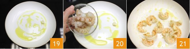 Prenez une poêle antiadhésive, faites chauffer un filet d'huile et laissez dorer une gousse d'ail épluchée 19. Versez les crevettes décortiquées 20 et faites-les sauter à feu moyen pendant environ 5 minutes, jusqu'à ce qu'elles soient bien rosées 21. Une fois cuites, laissez-les refroidir.