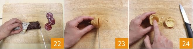 Maintenant, occupez-vous de la garniture des choux, qui auront sûrement refroidi. Placez le salami sur une planche à découper et coupez-le en tranches assez fines 22, puis prenez les choux et divisez-les en deux avec un couteau 23, enlevez ensuite avec les doigts les éventuels résidus de pâte à l'intérieur pour laisser de la place à la garniture 24.