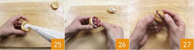 Sortez du réfrigérateur les poches à douille avec les crèmes : pressez la crème au jambon dans les choux que vous servirez avec le salami 25, puis placez une tranche de salami 26 et après avoir étalé un peu de crème également sur le chapeau, refermez le chou 27.