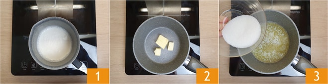Pour préparer le pudding au chocolat, chauffez le lait 1 dans une casserole jusqu'à frôler l'ébullition, à feu modéré. Dans une autre casserole, faites fondre le beurre 2 et ajoutez le sucre 3.