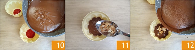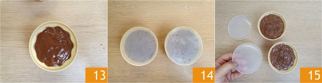 Laissez refroidir à température ambiante 13, couvrez avec les couvercles des moules 14, puis placez au réfrigérateur pendant au moins 3 heures. Une fois le temps écoulé, retirez les couvercles 15.