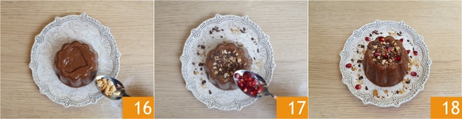 Renversez le pudding au chocolat sur une petite assiette et servez, en décorant la surface avec des amaretti émiettés, des éclats de chocolat et des grains de grenade 17, pour une touche de couleur 18.