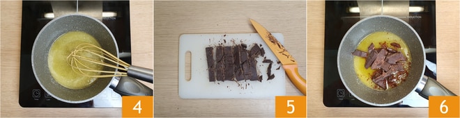 Mélangez avec un fouet pour amalgamer 4. Hachez le chocolat au couteau, assez grossièrement 5, et ajoutez-le dans la casserole avec le beurre 6. Faites fondre à feu modéré, en mélangeant avec un fouet à main.