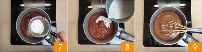 Lorsque le mélange est complètement fluide, ajoutez la fécule de maïs tamisée 7 et incorporez avec le fouet. De cette manière, vous éviterez les grumeaux. Comme dernière étape, versez également le lait chaud en filet 8, en mélangeant avec le fouet 9. Faites cuire le pudding pendant quelques minutes, jusqu'à ce qu'il commence à épaissir. Retirez du feu dès qu'il commence à se compacter : en refroidissant, il s'épaissira complètement.