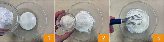 Pour préparer le pudding au gianduia avec sauce à l'orange, versez dans un bol la crème, la fécule de maïs 1 et la farine 2, mélangez avec le fouet 3.