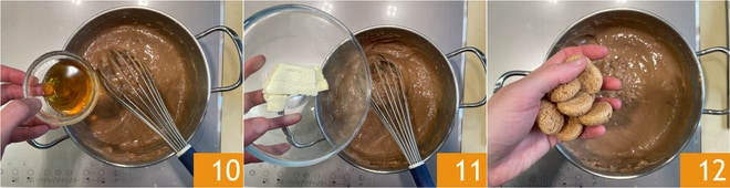 Ajoutez la liqueur d'amaretto 10, puis le beurre 11 et faites-le fondre. À ce stade, ajoutez les amaretti émiettés avec les mains 12.