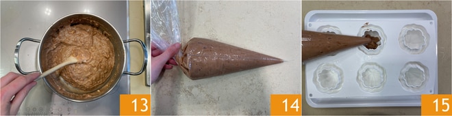 Mélangez encore 13 puis transférez le mélange dans une poche à douille 14, puis remplissez les moules à pudding en silicone 15. Les quantités se réfèrent à 4 moules de 150 g.