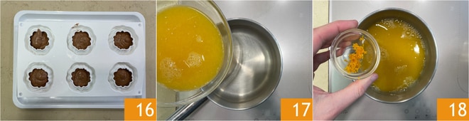 Placez au congélateur pendant 6 heures 16. Préparez la sauce à l'orange: dans une casserole, versez le jus d'orange 17 et le zeste 18 et faites chauffer.