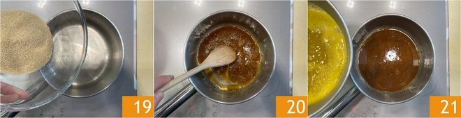 En même temps, dans une autre casserole, versez le sucre de canne 19 et faites-le fondre à feu doux 20. Maintenant, ajoutez le jus chauffé au caramel en trois fois 21.