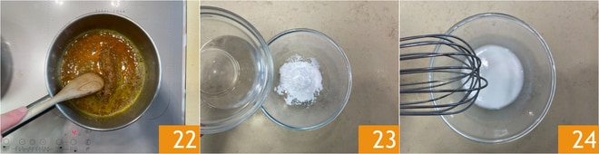 Laissez bouillir 22 et pendant ce temps, dans un bol, mélangez la fécule et la liqueur d'orange 23, délayez avec le fouet 24