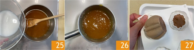 Incorporez la fécule dans le caramel 25, mélangez et laissez refroidir 26. Une fois que les puddings sont bien fermes, démoulez-les 27 et disposez-les sur un plat de service.