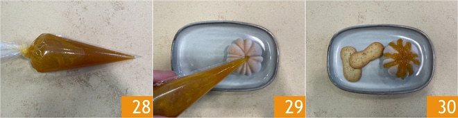 Transférez la sauce à l'orange refroidie dans une poche à douille 28 et garnissez les puddings 29, complétez avec des langues de chat au pistache 30