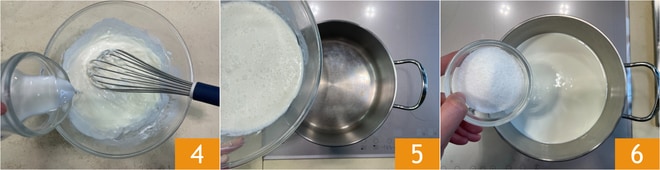 Ajoutez peu à peu le lait en mélangeant 4 puis transférez le mélange dans une casserole sur le feu 5, ajoutez le sucre semoule 6.