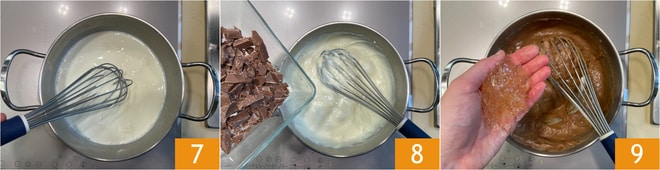 Une fois l'ébullition atteinte, cuisez encore pendant 1 minute, en mélangeant toujours 7. Puis éteignez le feu et ajoutez le chocolat gianduia 8, mélangez bien pour le faire fondre. Incorporez la gélatine préalablement ramollie dans de l'eau et essorée 9.
