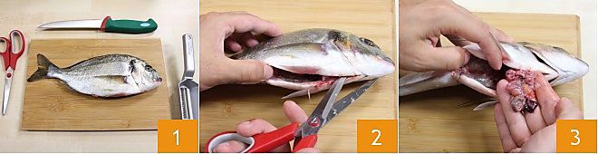Disposez le poisson sur une planche à découper et commencez à l'éviscérer : avec les ciseaux, faites une incision sur le ventre et progressez jusqu'à sous la tête 2, puis recueillez les viscères à la main et éliminez-les 3.