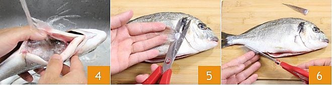 Lavez bien le ventre du poisson sous l'eau courante pour enlever toute trace de sang restante 4. Retirez maintenant les nageoires : avec les ciseaux, coupez d'abord la nageoire latérale située près de la tête 5, puis coupez la nageoire caudale située sous le ventre 6.