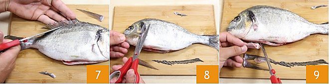 et celle dorsale 7. Retournez le poisson de l'autre côté et retirez l'autre nageoire latérale 8 et celle caudale 9.
