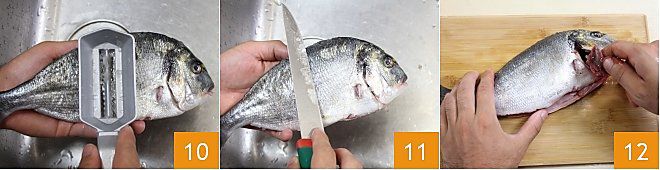 Avec l'outil écailleur 10 ou avec la lame d'un couteau 11, écaillez soigneusement la dorade, en passant à plusieurs reprises de la queue vers la tête (nous conseillons de faire cette opération sous l'eau courante, ou en plaçant le poisson dans un sac, pour éviter de disperser les écailles partout). Passez la dorade sous l'eau courante, en la lavant également soigneusement à l'extérieur. Si vous souhaitez cuisiner le poisson entier, au four ou au grill, le nettoyage s'arrête ici et la dorade est prête à être assaisonnée et cuisinée. Si vous avez besoin de filets de dorade, placez la dorade sur la planche et retirez les branchies (situées sous les deux ouvertures semi-circulaires sur les côtés de la tête), en les extrayant manuellement 12.