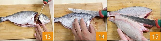 Avec le couteau à fileter, entamez la tête et retirez-la 13, puis incisez la queue et la partie dorsale du poisson le long de la colonne vertébrale 14, en partant du haut, et progressez en déplaçant la lame, horizontalement par rapport au plan de travail, pour obtenir le premier filet 15.