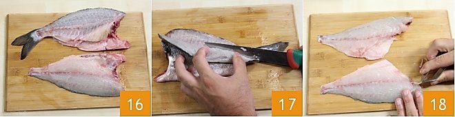Séparez maintenant les deux moitiés du poisson 16. Procédez de la même manière, en séparant toutefois la chair de l'arête pour obtenir le deuxième filet (en réalisant cette opération, faites attention à ne pas enlever trop de chair) 17. Éliminez toutes les éventuelles arêtes présentes en utilisant une pince à épiler 18 (aidez-vous en passant une main sur la chair pour les repérer), puis retirez la peau en utilisant avec précaution le couteau, pour ne pas gaspiller la chair du poisson. Vos filets de dorade sont prêts à être cuisinés !