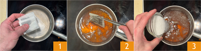 Pour réaliser le Punch de Noël, commencez par préparer le thé: portez l'eau à ébullition dans une petite casserole, puis ajoutez les sachets de thé 1 et laissez infuser hors du feu pendant environ 6-7 minutes. Retirez les sachets 2 et ajoutez le sucre 3.