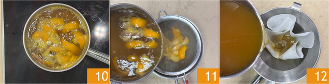 Réchauffez à nouveau la casserole et laissez frémir pendant environ 2-3 minutes 10. À ce stade, filtrez le mélange avec une passoire fine 11; pour obtenir un liquide encore plus clair, vous pouvez utiliser de l'étamine ou un papier absorbant 12.
