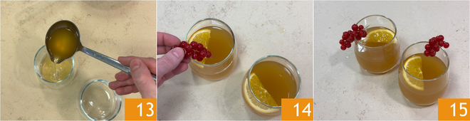 Remplissez 4 verres d'une capacité de 200 ml chacun 13 et garnissez chacun avec une demi-tranche d'orange et les groseilles 14. Votre Punch de Noël est prêt à être dégusté bien chaud 15!