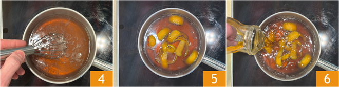 Mélangez et laissez dissoudre complètement 4, puis ajoutez les zestes d'orange 5 et le rhum 6.