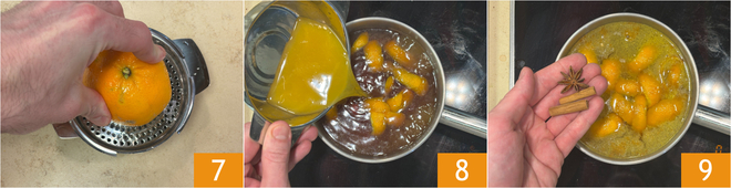 Pressez les oranges 7; vous devez obtenir 200 g de jus. Versez le jus d'orange dans la casserole 8, puis parfumez avec l'anis étoilé et la cannelle 9.